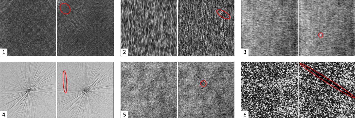 - Target 도메인의 데이터셋은 DAGM을 사용합니다. DAGM 데이터셋은 그림 5와 같이 총 여섯 종류의 섬유 재질 배경 위에 결함이 있는 데이터셋입니다. Target 도메인의 문제는 DAGM의 여섯 종류의 섬유 재질을 분류함과 동시에 결함인지 아닌지까지 분류하는 classification 문제입니다. 각 섬유 재질은 1000개의 정상 데이터와 150개의 결함 데이터로 구성되어 있습니다.